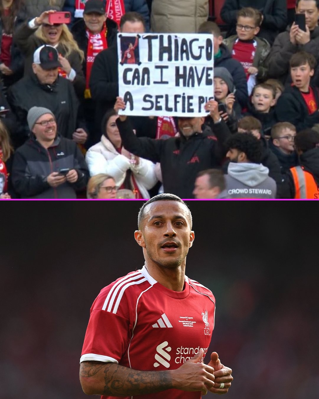 现场球迷拍摄到,克洛普高举一块手写标语牌,向昔日弟子蒂亚戈发出合影邀约,牌面清晰写着:“蒂亚戈,能和我合张影吗?”