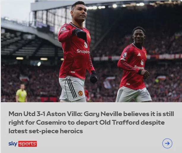 对此天空体育表示,曼联拥有卡塞米罗的合同延长条款,但双方已经就不续约达成一致,并且目前没有反转的迹象。