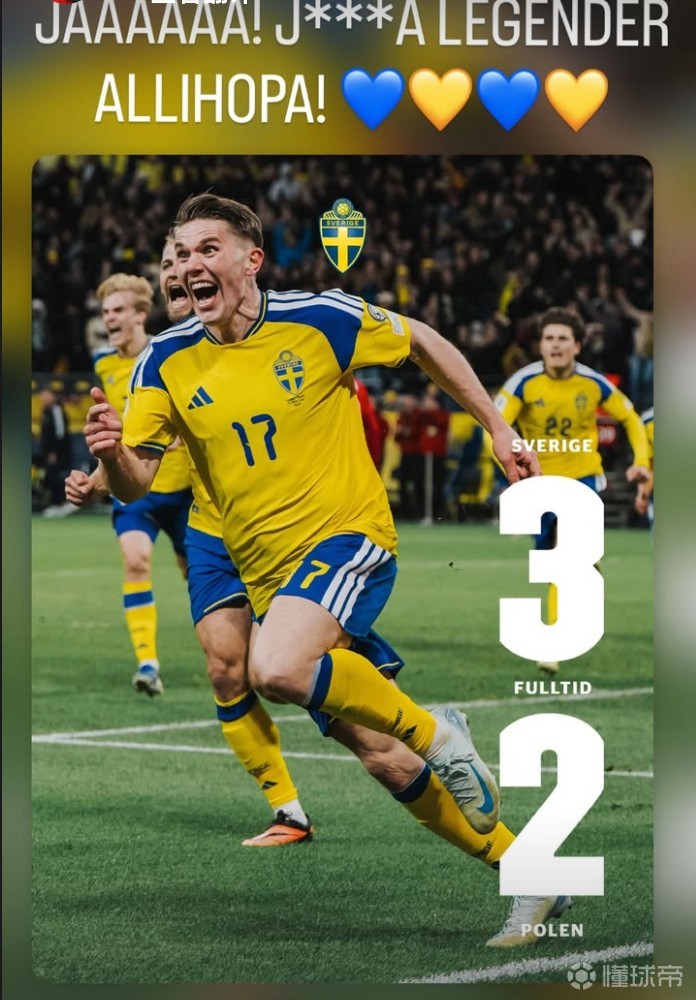 北京时间4月1日,在世预赛欧洲区附加赛决赛中,瑞典主场3-2战胜波兰成功晋级2026年美加墨世界杯决赛圈,赛后目前因伤缺阵的利物浦前锋伊萨克在社交媒体上发文庆祝了球队的胜利。