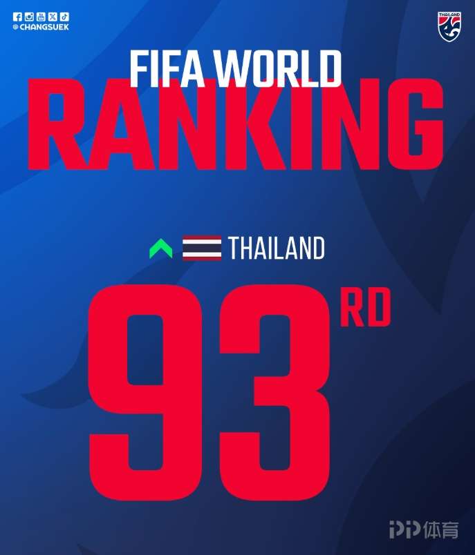 亚洲杯预选赛D组第6轮,泰国第89分钟2-1绝杀土库曼斯坦,惊险挺进亚洲杯正赛,赛后泰国即时排名反超国足,升至第93位。