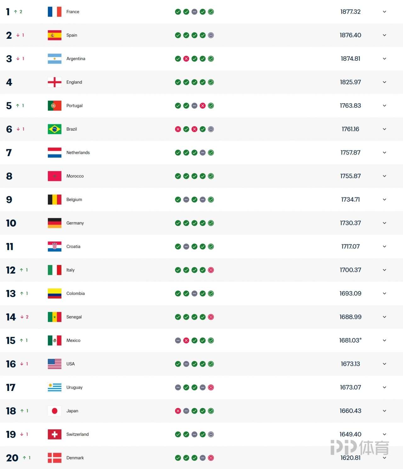 FIFA排名更新,法国连超西班牙和阿根廷升榜首,意大利升至第12,日本第18,国足排名遭泰国反超跌至第94位,亚足联第15。FIFA排名前20的球队中,只有意大利和丹麦未进2026美加墨世界杯。