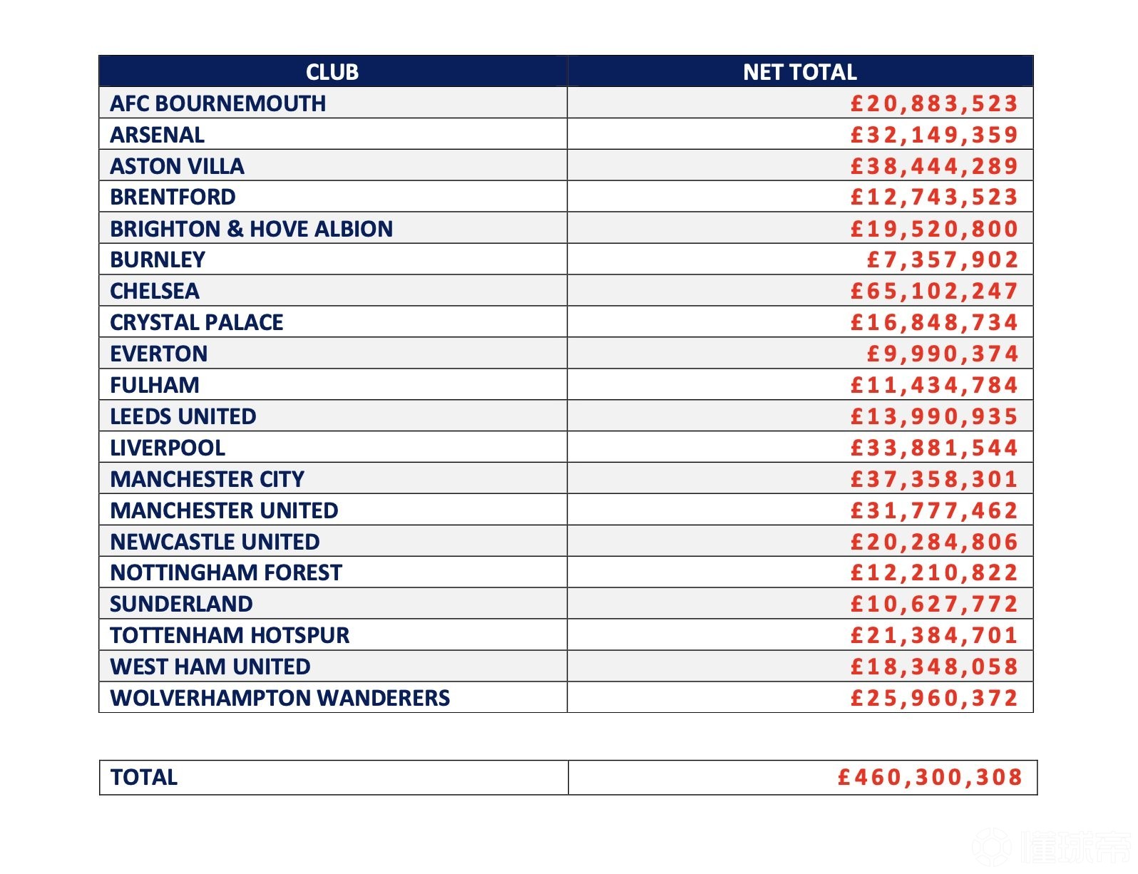 英足总统计英超俱乐部经纪人佣金支出(2025年2月4日至2026年2月2日):