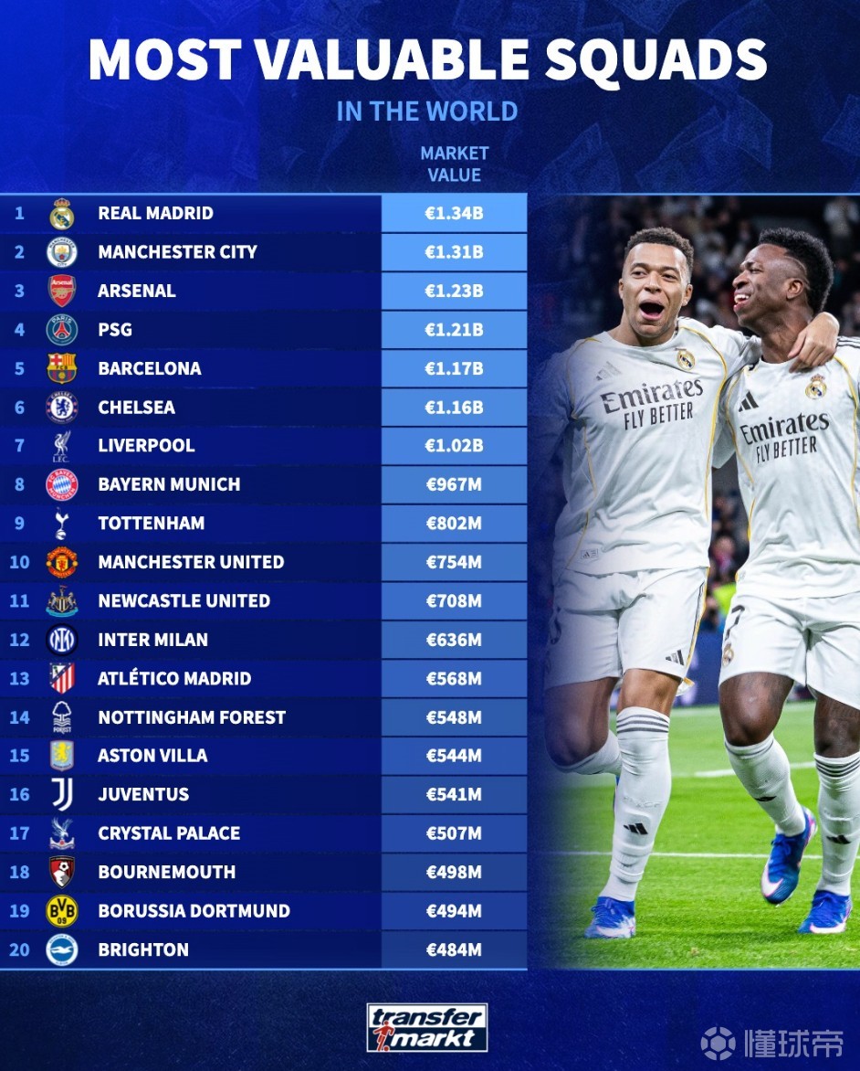北京时间4月1日,在完成了新一轮的球员身价更新之后,德转列出了目前世界足坛身价排名前20的俱乐部,皇家马德里以13.4亿欧元位居第一,曼城13.1亿欧元第二,阿森纳12.3亿欧元第三。