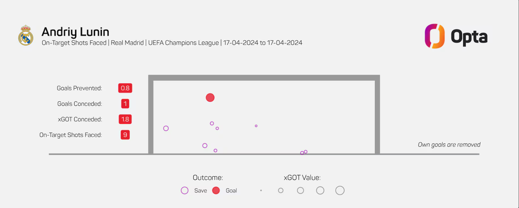 就这样来到了这个赛季,本来没什么出场机会(只在奥林匹亚科斯、塔拉韦拉和阿尔瓦塞特踢了几场),直到库尔图瓦在欧冠对阵曼城时右腿股四头肌直肌撕裂,卢宁再次迎来了机会。他在伊蒂哈德球场表现神勇,马德里德比面对马竞更是完成了8次扑救,成功率接近87%。