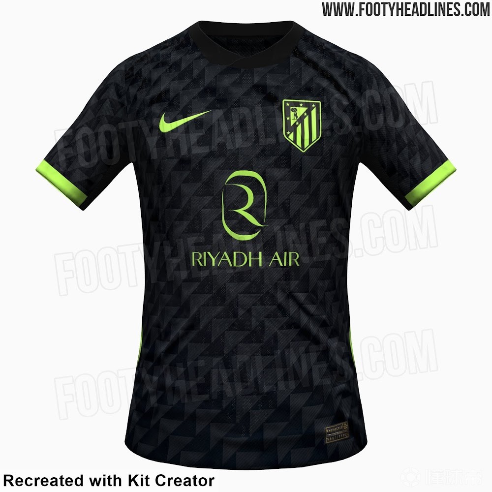 这款球衣在深色底衫上加入了微妙的几何纹理,由重复三角形组成,形成现代感的锯齿效果,胸部与袖子均有延展。黑色圆领简约大方,袖口和侧面面板使用荧光绿色边饰,与耐克Logo、赞助商Riyadh Air以及马竞徽章的荧光绿相呼应,整体呈现高度统一的单色美感。