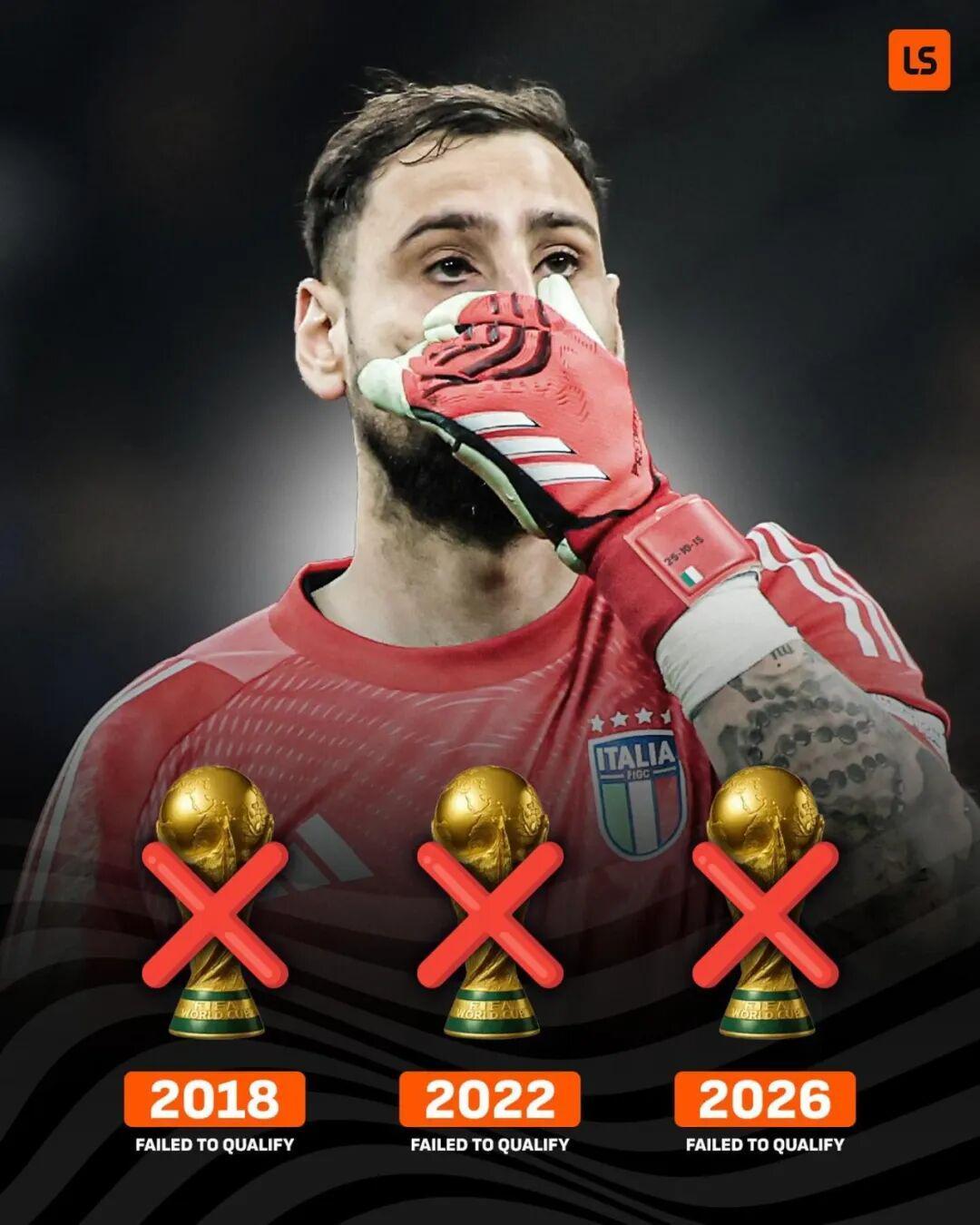 蓝衣军团成为8支世界杯冠军队之中,唯一连续3届无缘世界杯的球队。此前乌拉圭(1974—1978年和1994—1998年)、英格兰(1974—1978年)夺冠后曾连续两届无缘世界杯,而意大利足球的自我毁灭,更是前所未有。