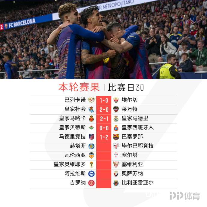 西甲第30轮,马竞1-2巴萨。此役之后巴萨在积分榜上的领先优势扩大到7分!