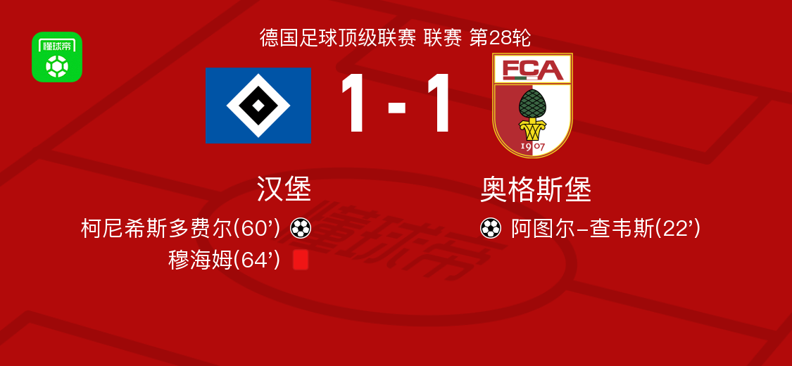 北京时间4月4日德国足球顶级联赛 联赛 第28轮,汉堡主场对阵奥格斯堡。汉堡柯尼希斯多费尔破门。奥格斯堡阿图尔-查韦斯破门。最终比分汉堡 1-1 奥格斯堡。