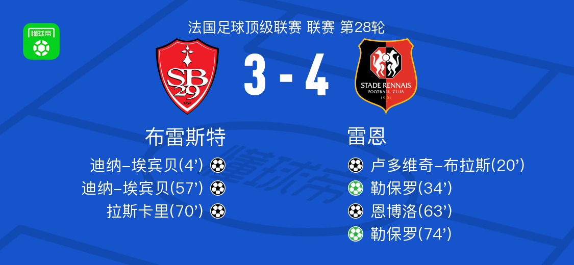 北京时间4月5日法国足球甲级联赛第28轮,布雷斯特主场迎战雷恩。比赛中,布雷斯特球员迪纳-埃宾贝接队友助攻率先破门,随后雷恩球员卢多维奇-布拉斯接队友助攻扳平比分,之后勒保罗罚入点球帮助雷恩反超。下半场,迪纳-埃宾贝再次接队友助攻破门,布雷斯特将比分追平,但雷恩球员恩博洛随即破门,随后拉斯卡里为布雷斯特扳平比分,最后勒保罗再次罚入点球,雷恩锁定胜局。最终布雷斯特3-4不敌雷恩。
