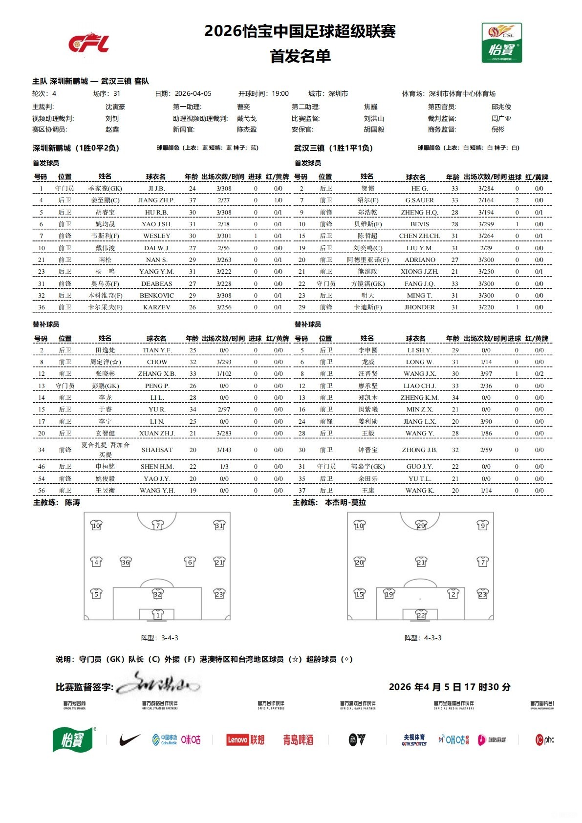 北京时间4月5日19:00,中超联赛第4轮,深圳新鹏城坐镇主场迎战武汉三镇,本场比赛主裁判是沈寅豪,VAR是刘钊。赛前双方公布首发: