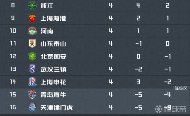 中超第4轮战罢,本轮结束后,中超9支负分球队仍处后9位。本轮上海海港取胜将积分转正,国安、三镇、申花、海牛和津门虎暂未抹去负分。