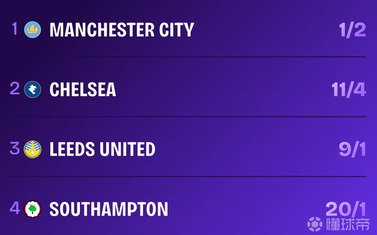 足总杯四强夺冠赔率:曼城第1,切尔西第2,南安普顿第4