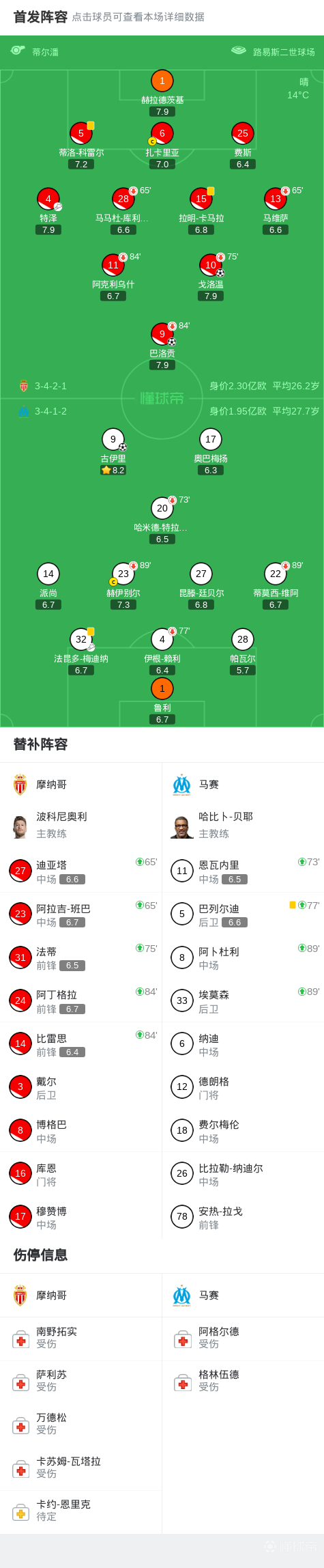北京时间4月6日法国足球顶级联赛 第28轮,摩纳哥主场对阵马赛。下半场戈洛温首开记录,巴洛贡破门扩大领先优势,古伊里扳回一球。最终比分摩纳哥 2-1 马赛。