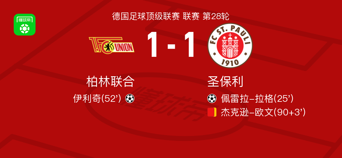 北京时间4月5日德国足球顶级联赛 联赛 第28轮,柏林联合主场对阵圣保利。柏林联合伊利奇破门。圣保利佩雷拉-拉格破门。最终比分柏林联合 1-1 圣保利。