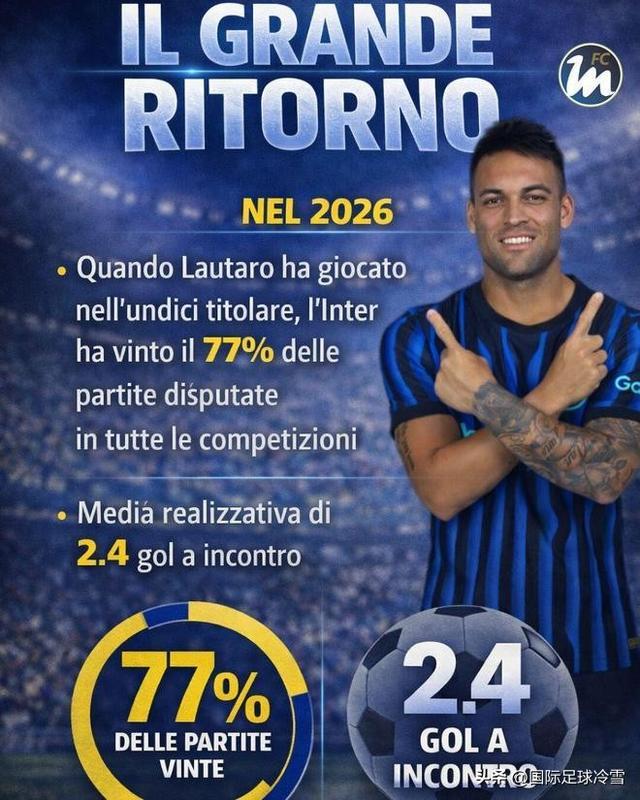 2026年来,劳塔罗首发的比赛里,国米胜率是77%,每场攻入2.4球。在他缺席的7场比赛里,国米胜率只有29%,场均进球锐减为1.0个。面对如此巨大的差异,《米兰体育报》评论:“如果之前还有人怀疑劳塔罗的重要性,怀疑这位队长究竟有多么不可或缺,那么现在,这些疑虑都烟消云散了。”