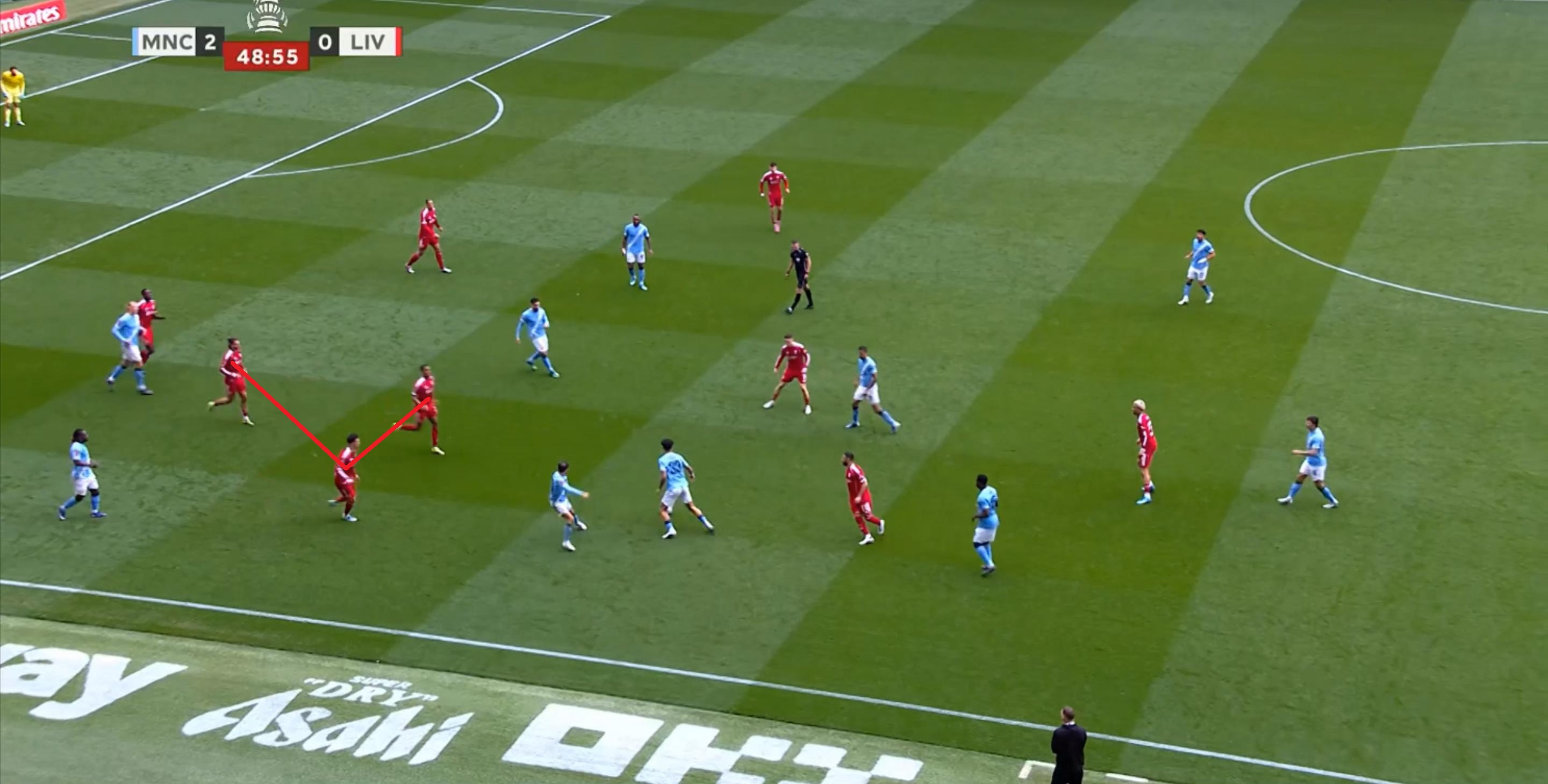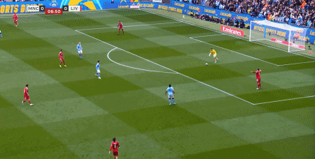所以在进攻的时候,利物浦的双前锋会拉得非常开,几乎会呈现出各自负责一个半扇的思路,以此来吸引曼城的防守注意力,从而为中路和远端制造空间。