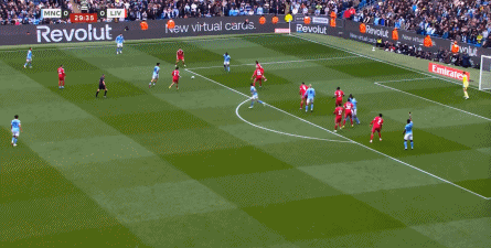 最终在第37分钟,曼城在定位球二次进攻里,不断地用带球和前插来制造利物浦的压力,一点点打到后卫线上,从而制造了范戴克的犯规和点球机会: