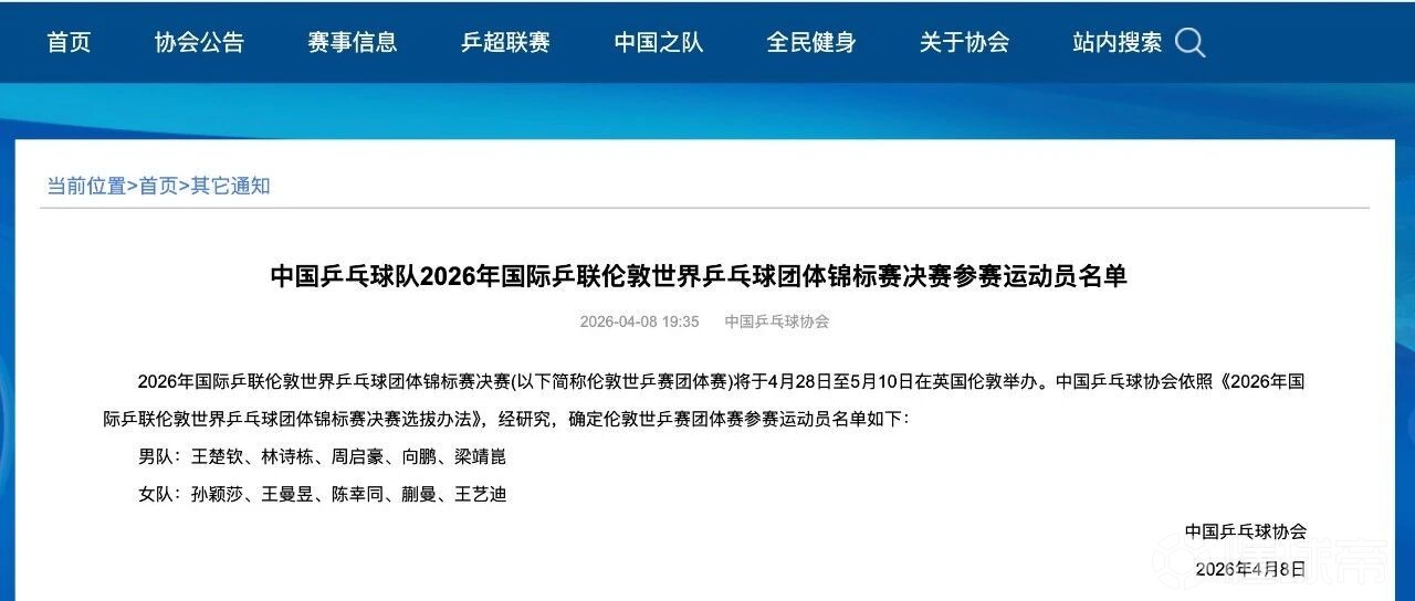 中国乒乓球协会依照《2026年国际乒联伦敦世界乒乓球团体锦标赛决赛选拔办法》,确定伦敦世乒赛团体赛参赛运动员名单如下: