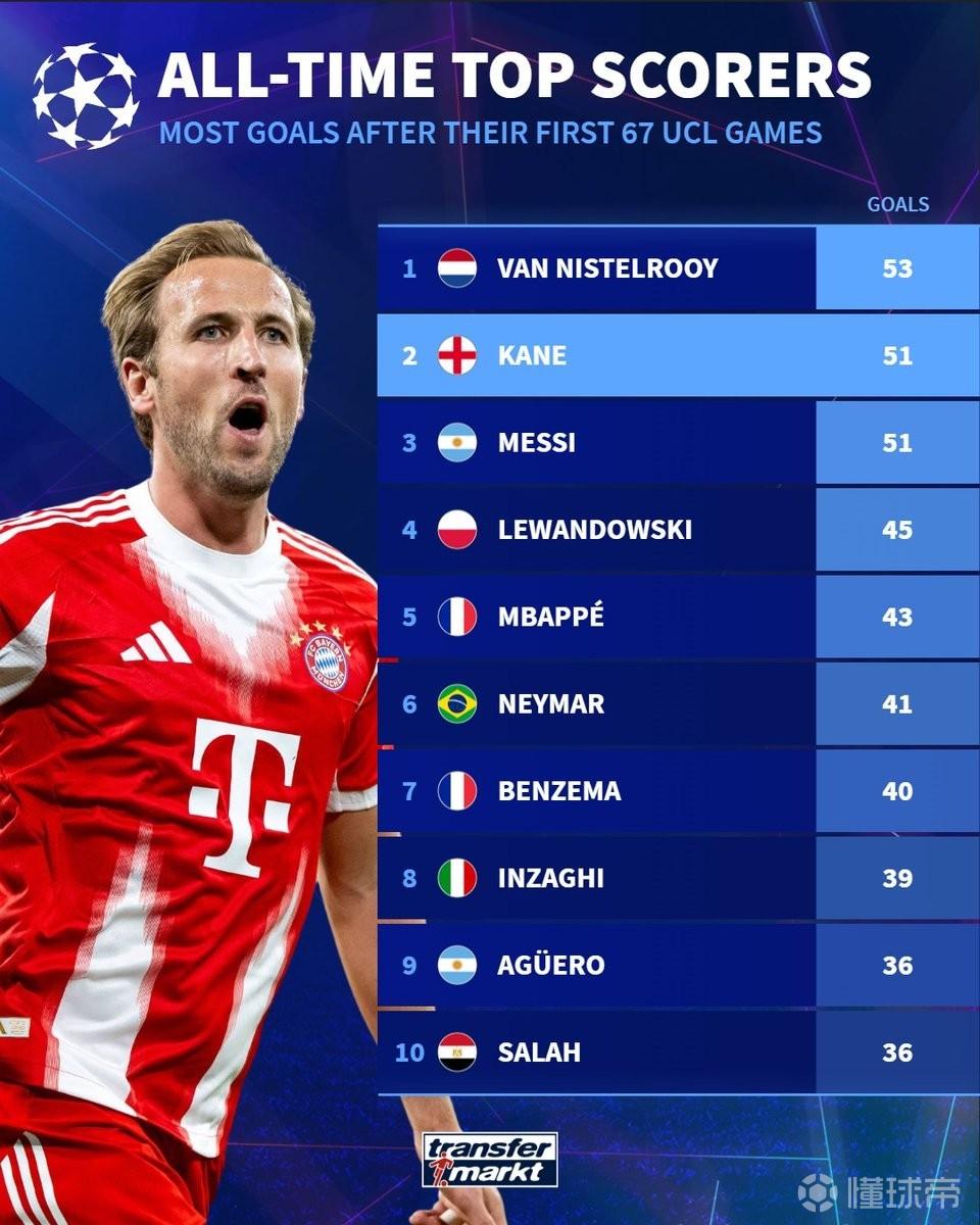 凯恩欧冠生涯前67场打入51球,仅次于范尼