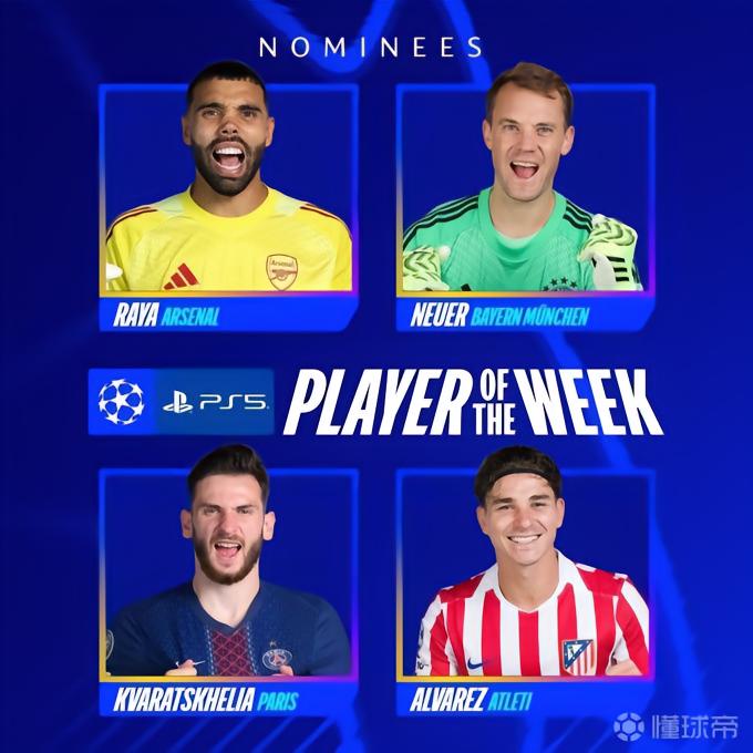 欧冠1/4决赛首回合4场比赛全部战罢,欧冠官方公布了本周最佳球员候选名单,分别是戴维-拉亚、诺伊尔、克瓦拉茨赫利亚和阿尔瓦雷斯。
