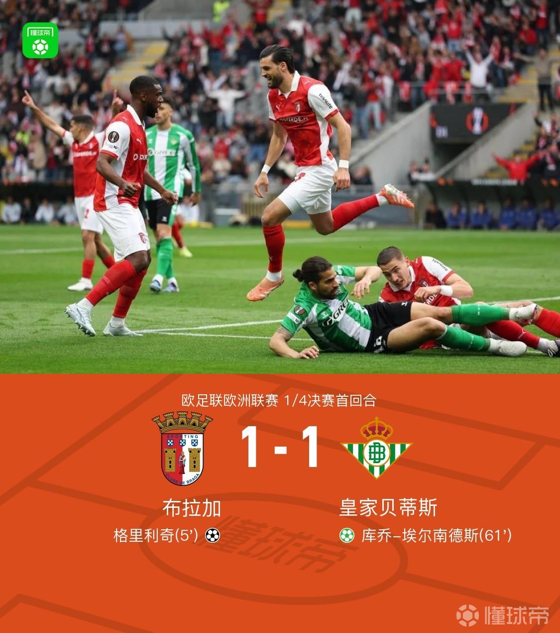 北京时间4月9日欧足联欧洲联赛1/4决赛首回合,布拉加对阵皇家贝蒂斯。格里利奇闪击,下半场阿布德造点,库乔-埃尔南德斯点射破门。最终比分布拉加 1-1 皇家贝蒂斯。