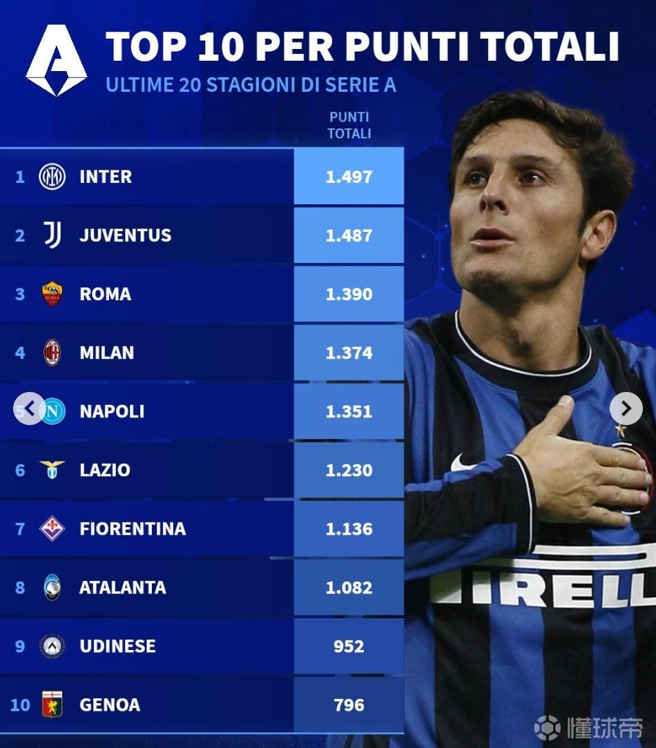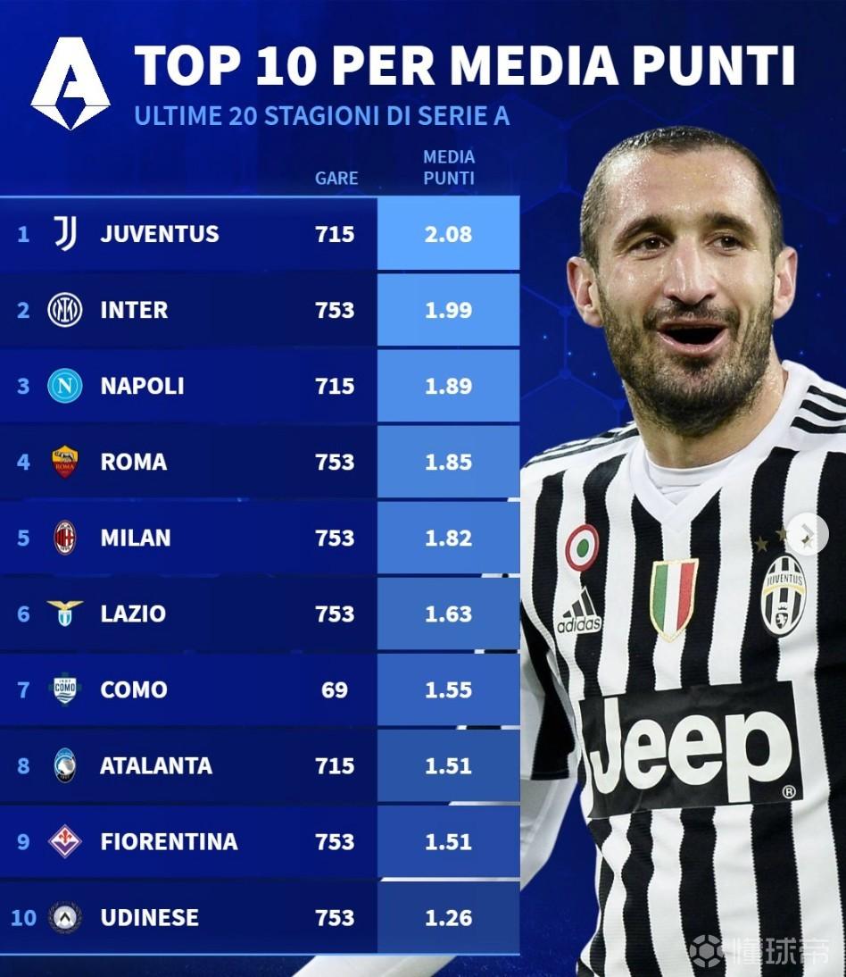 北京时间4月9日,德转统计出了意甲近20年场均积分和总积分排名前10的球队,尤文图斯和国际米兰分别在两份榜单中位居第1。