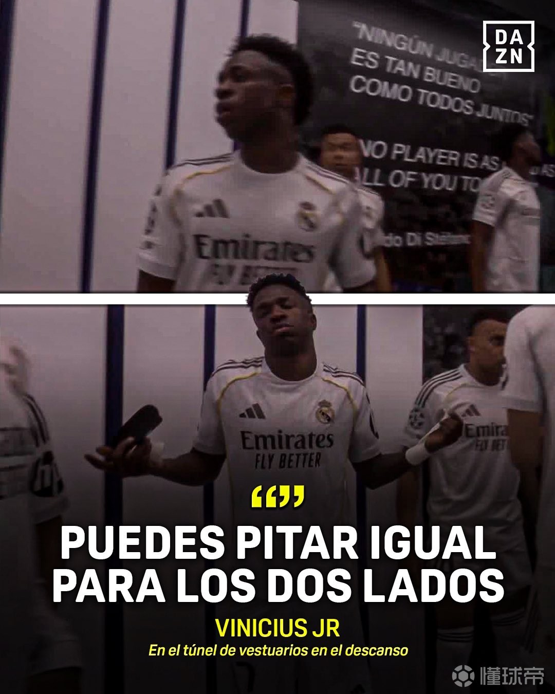 据转播方DAZN拍摄的镜头显示,半场休息时,维尼修斯在球员通道内抱怨道:“裁判应一视同仁、公平执法。”