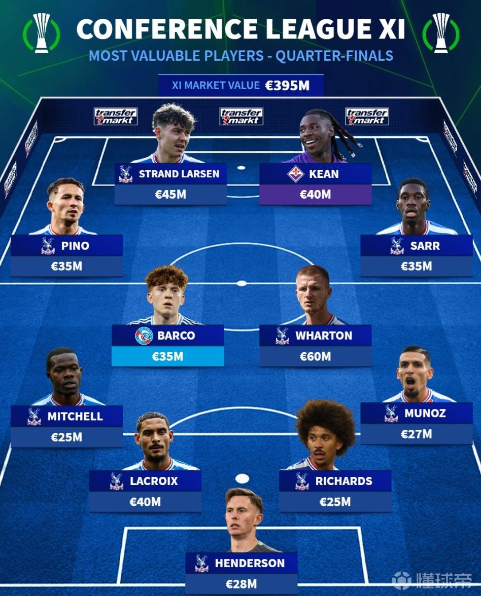 北京时间4月9日,在欧协联1/4决赛首回合的比赛即将打响的情况下,德转列出了赛事这一阶段8支参赛球队最贵的11人阵容,水晶宫9人入围,另外两名球员则是佛罗伦萨前锋莫伊塞-基恩和斯特拉斯堡中场巴伦廷-巴尔科。