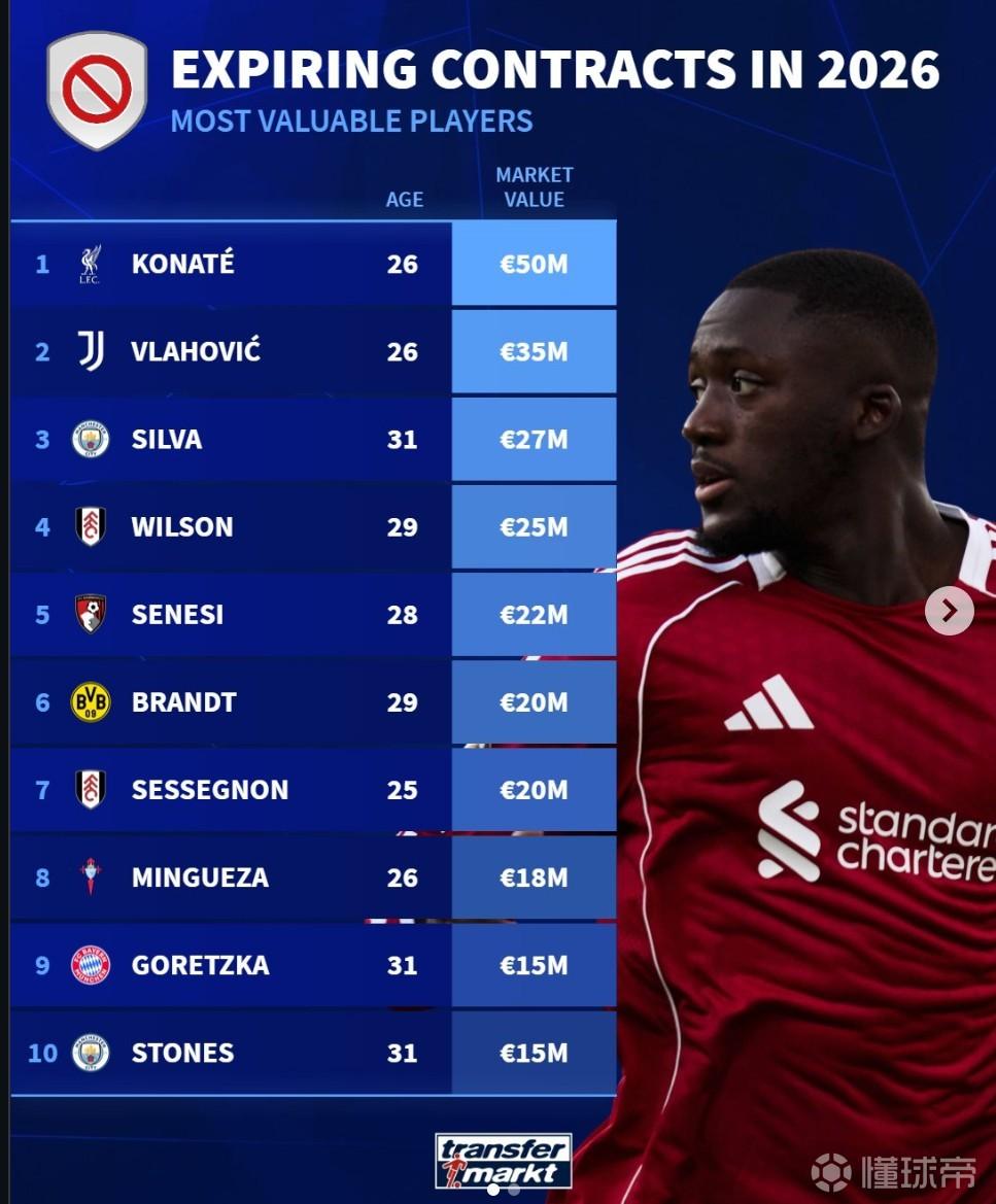 德国转会市场列出了今夏合同到期球员的身价榜,科纳特5000万欧元领跑,弗拉霍维奇、B席在列。