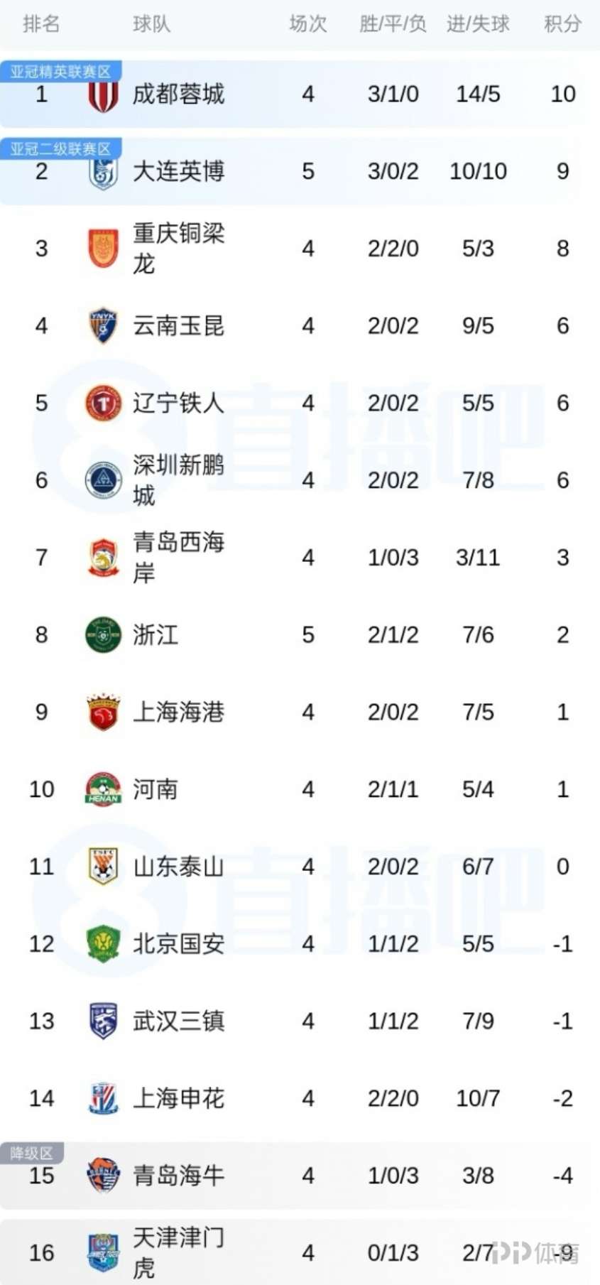 中超第5轮今日先赛一场,英博3-0完胜浙江,积分榜上英博先赛距榜首1分,浙江仍积2分暂排第8位。