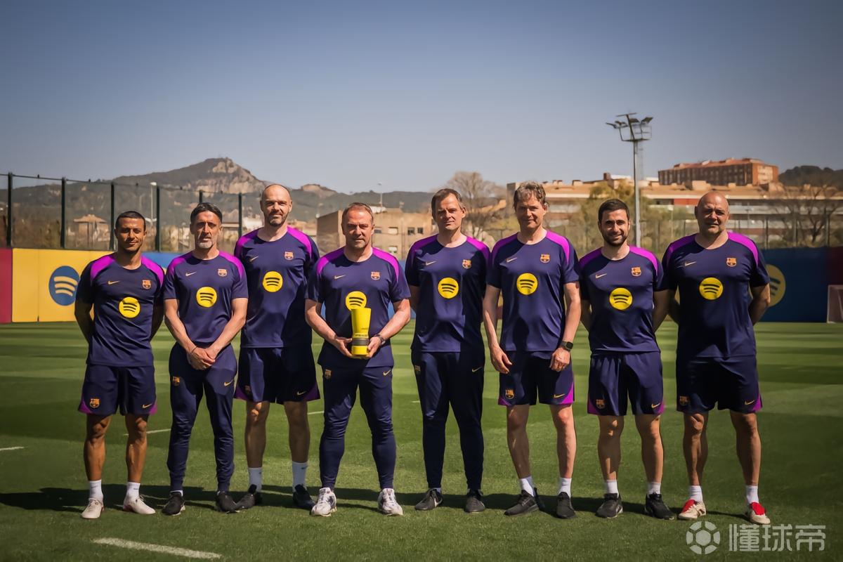 当地时间周五,巴萨官方晒出了弗里克在训练基地手捧西甲三月最佳主帅奖杯的照片,和他一起领奖的还有他的教练团队。