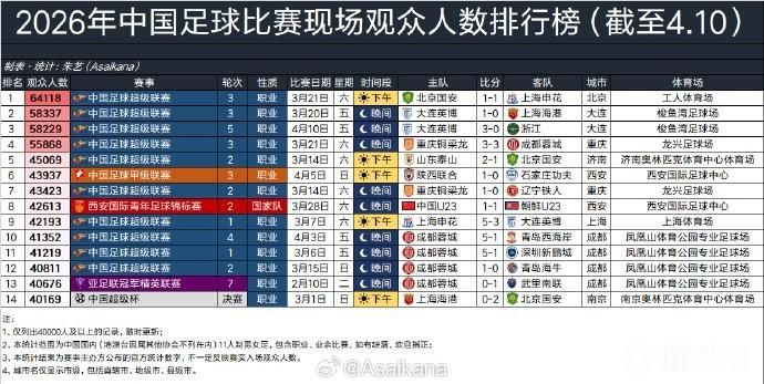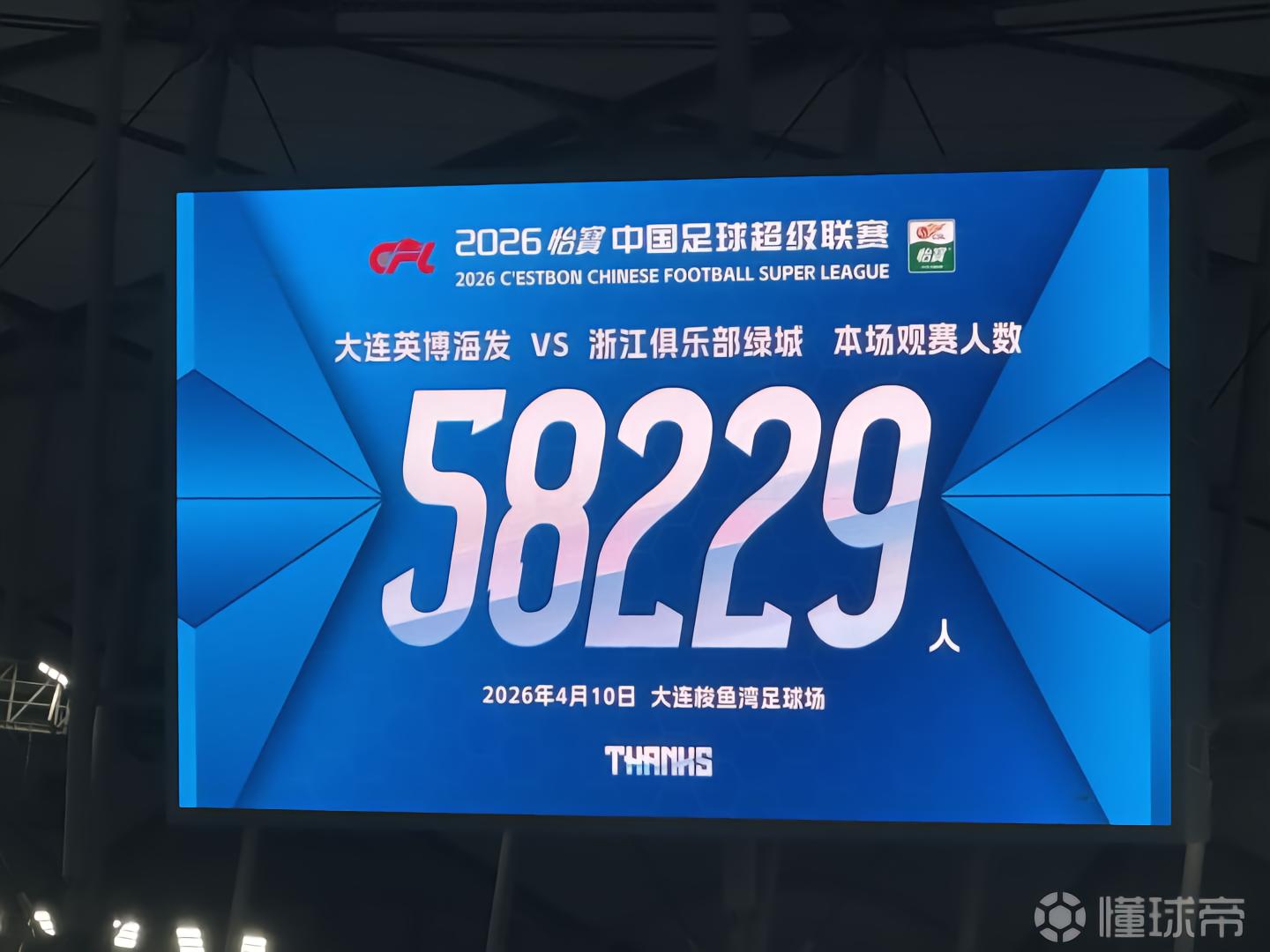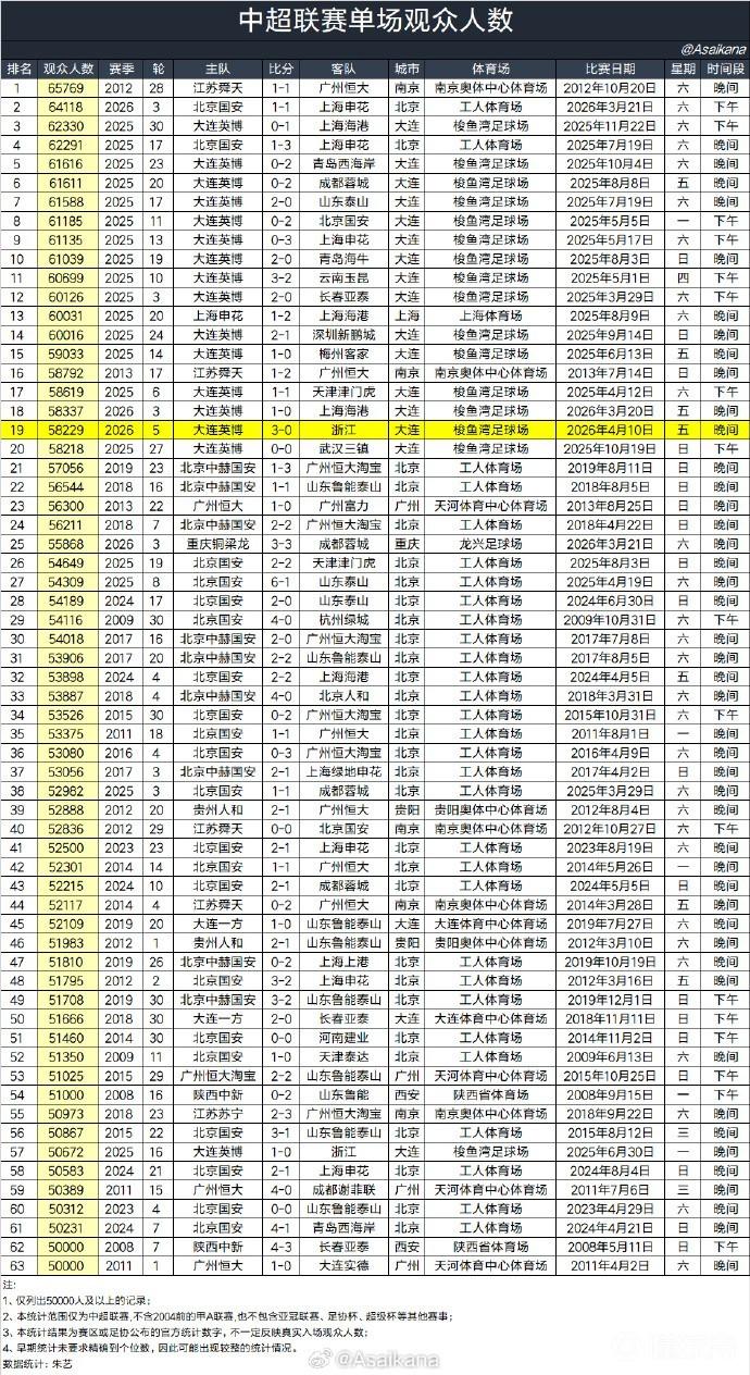 中超第5轮,大连英博主场3-0完胜浙江队,本场比赛共有58229人来到现场观战。据德转管理员朱艺@Asaikana 统计,本场观众人数排名中超历史第19,在今年所有中国足球比赛中暂列第3位。