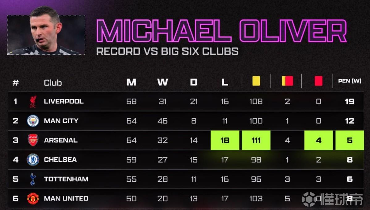 数据显示,奥利弗执法过阿森纳64场比赛,总共向阿森纳出示过111张黄牌和4张红牌,这两项数据均为其执法所有球队之最,显示出枪手在其判罚尺度下受到的纪律处罚尤为突出。