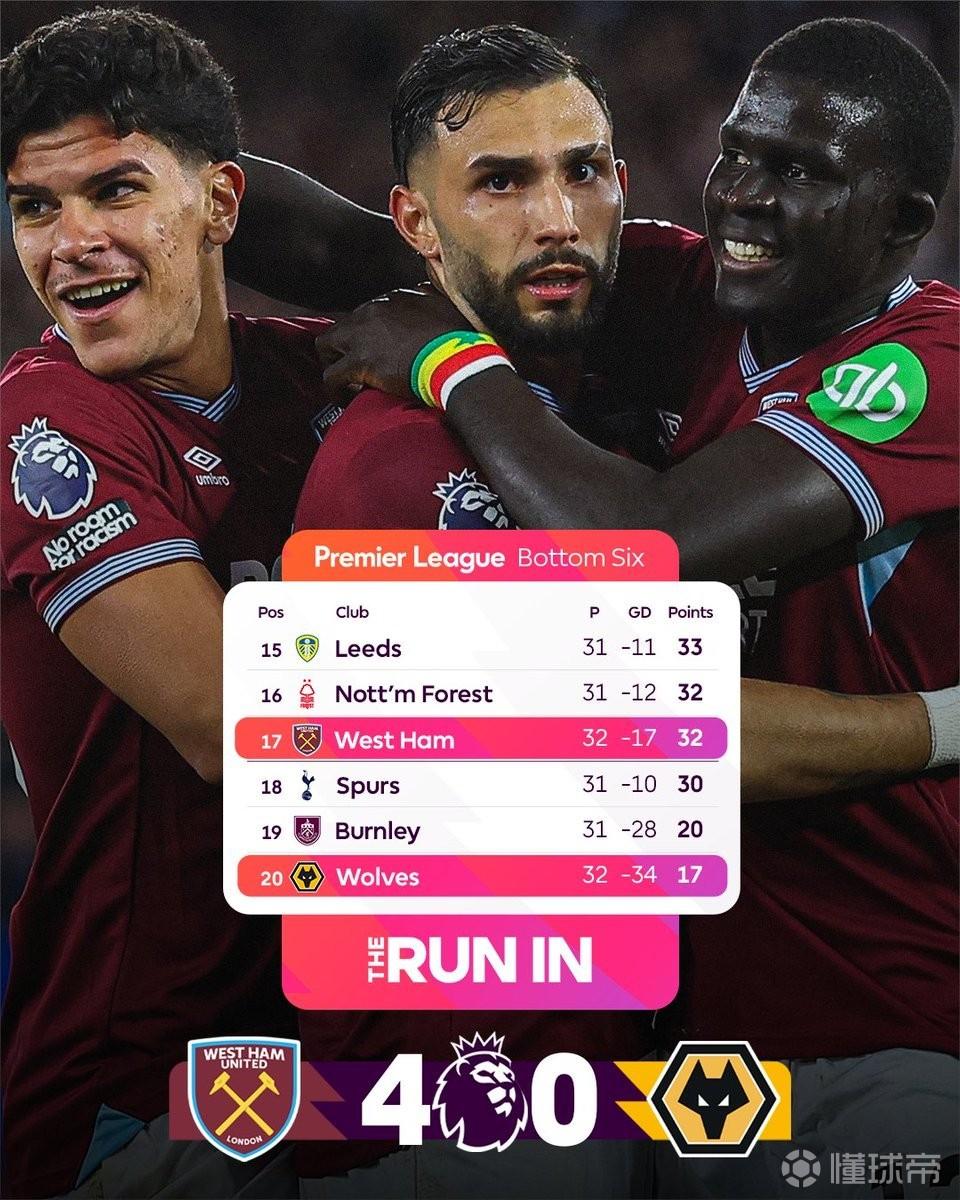 英超第32轮首场比赛中,西汉姆联主场4-0大胜副班长狼队,以32分升至联赛第17位,暂时跳出降级区。