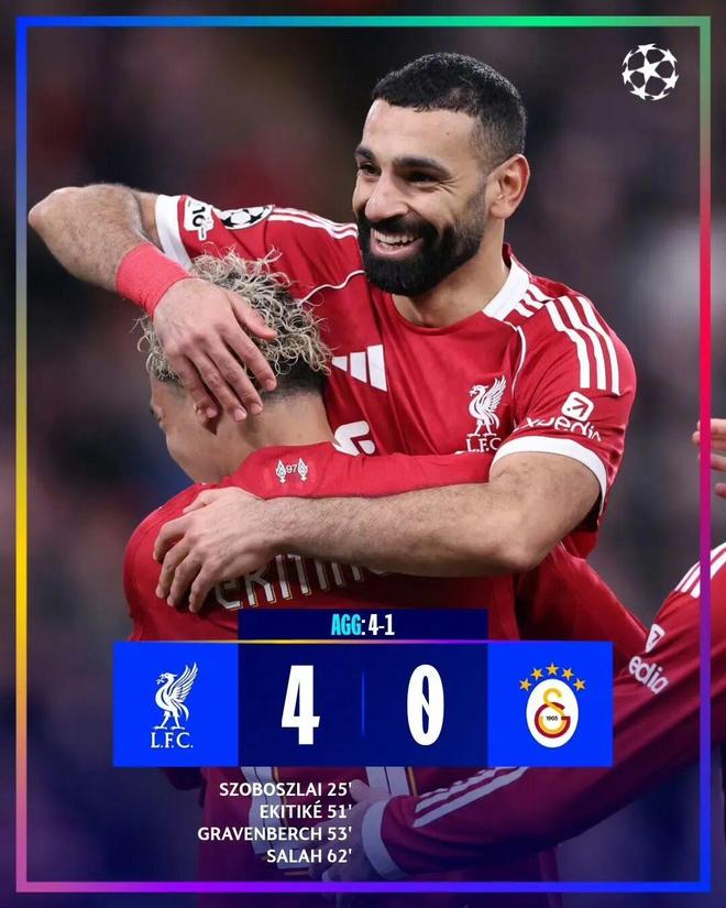 北京時間3月19日凌晨4點,歐冠八分之一決賽次回合較量,首回合0比1輸球的利物浦回到主場再戰加拉塔薩雷。上半場比賽,麥卡利斯特角球助攻索博斯洛伊推射破門,隨後索博斯洛伊造點,薩拉赫點球被恰基爾撲出。易邊再戰,薩拉赫助攻埃基蒂克建功取得兩球領先,赫拉芬貝赫補射擴大比分,辛戈烏龍由於弗林蓬越位在先被吹,薩拉赫內切世界波破門完成一傳一射。最終,利物浦4比0、總比分4比1復仇加拉塔薩雷,淘汰賽下輪將戰巴黎聖日耳曼。