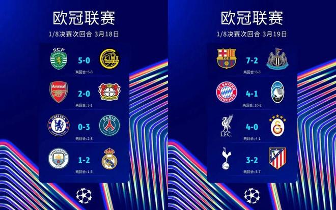 北京時間3月19日,歐冠1/8決賽次回合最後四次對決結束。本輪,英超球隊遭遇重創,切爾西、曼城分別遭巴黎、皇馬雙殺出局,熱刺雖主場險勝馬競仍填客場慘敗大坑,首回合主場戰平巴薩的紐卡斯爾聯則在客場2比7慘遭屠戮——除阿森納輕取勒沃庫森獲得晉級門票外,僅利物浦主場四球大勝加拉塔薩雷逆轉總比分晉級;西甲三強則全部晉級8強,展現底蘊;葡萄牙體育常規時間3比0、總比分3比3戰平博德閃耀進入加時賽,加時賽葡體再進2球,完成神奇逆轉送黑馬出局;拜仁則再送意甲獨苗亞特蘭大一場慘敗,總比分10比2輕松過關。
