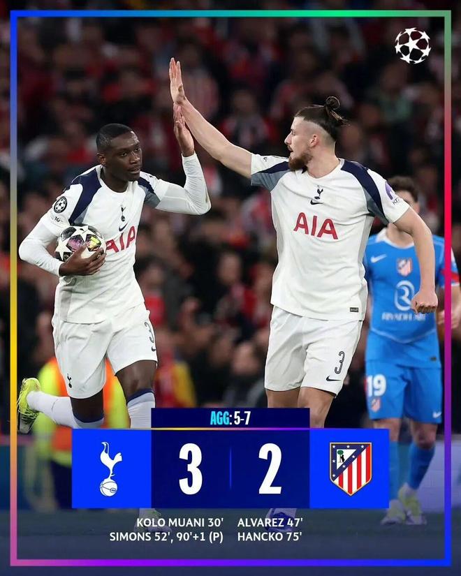 北京時間3月19日凌晨4點,歐冠八分之一決賽次回合較量,首回合2比5輸球的托特納姆熱刺回到主場再戰馬德裡競技。上半場比賽,盧克曼進球被吹,穆阿尼禁區內無人盯防頭槌破門先下一城,維卡裡奧獻神撲。易邊再戰,阿爾瓦雷斯勁射扳平比分,哈維·西蒙斯世界波建功,漢茨科頭槌還以顏色再度扳平比分,哈維·西蒙斯造點親自主罰命中完成梅開二度。最終,托特納姆熱刺3比2、總比分5比7遭馬德裡競技淘汰,無緣8強。