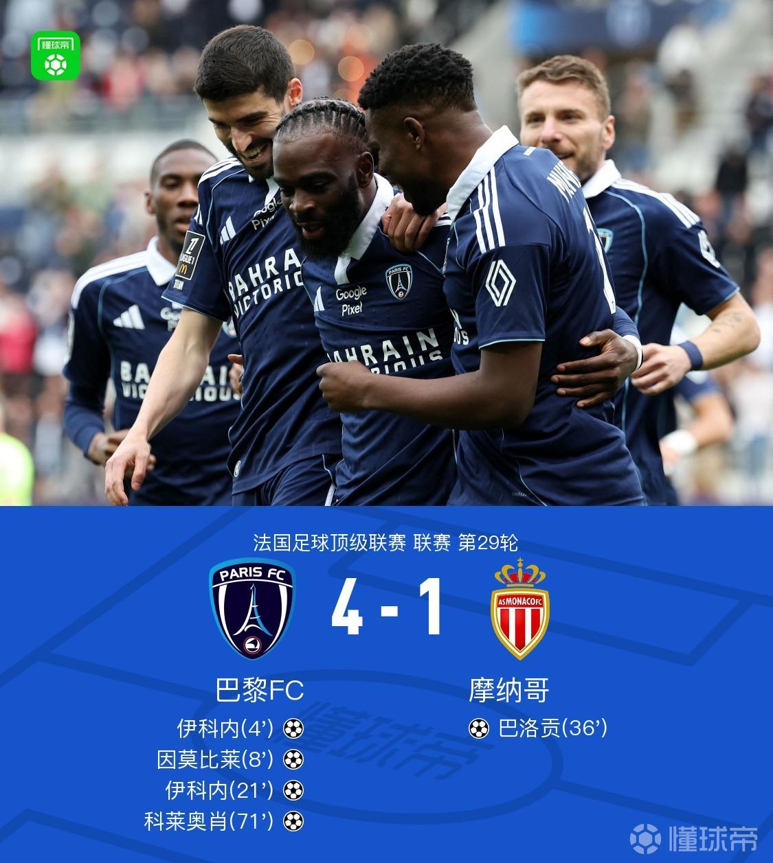 北京时间4月11日法国足球顶级联赛第29轮,巴黎FC主场对阵摩纳哥。开场4分钟伊科内闪击,随后因莫比莱破门扩大领先优势,伊科内梅开二度,巴洛贡扳回一球。下半场科莱奥肖破门再下一城。最终比分巴黎FC 4-1 摩纳哥。