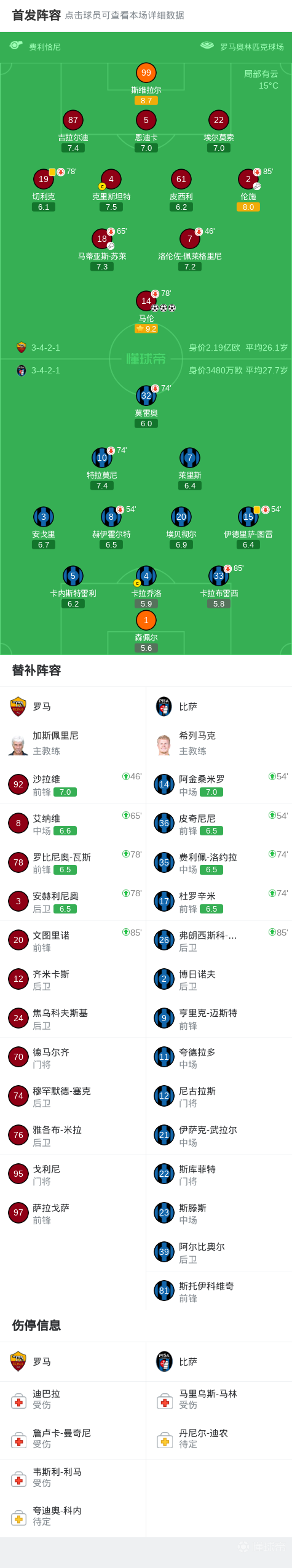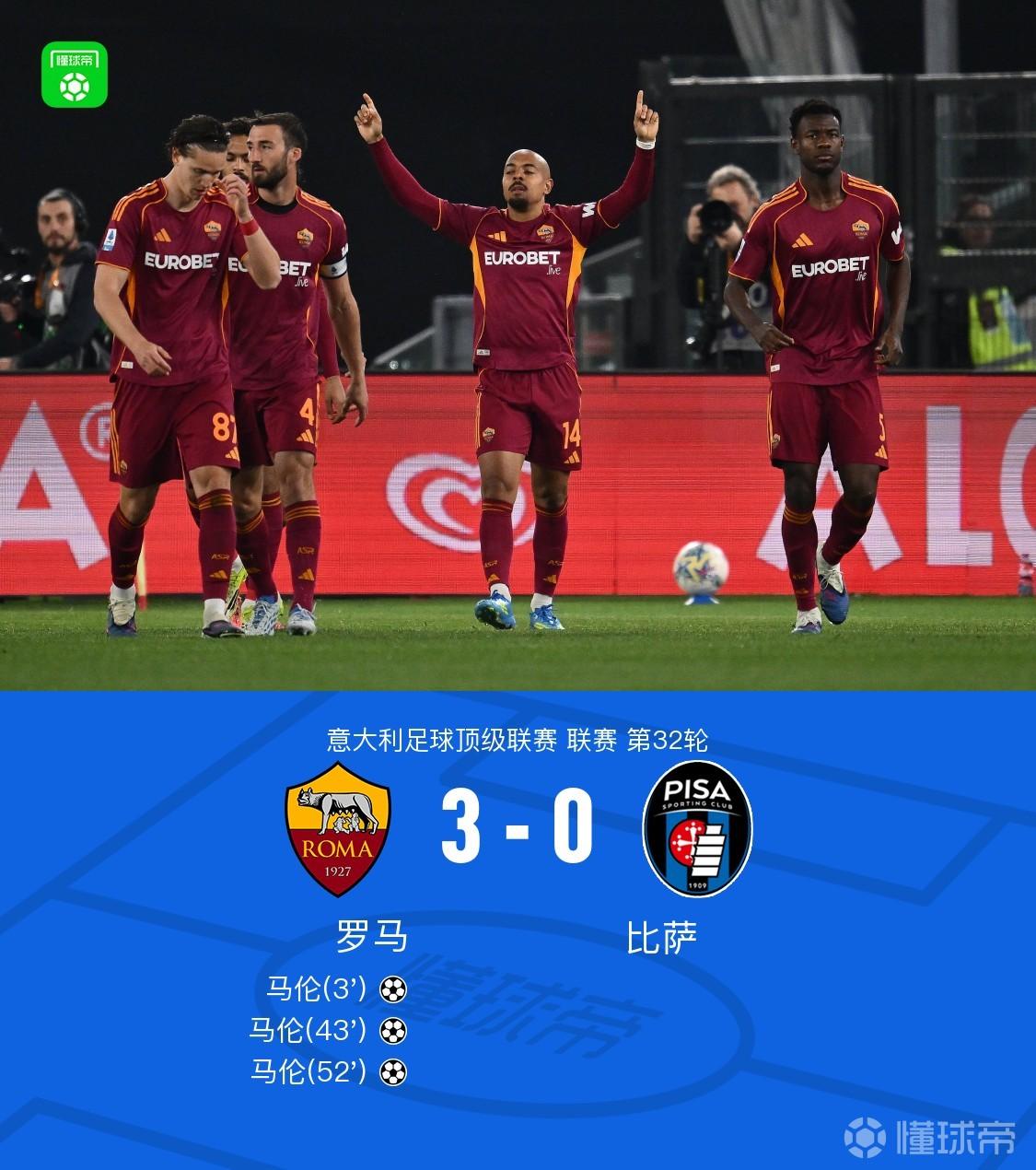 北京时间4月11日意大利足球顶级联赛第32轮,罗马主场对阵比萨。上半场开场仅3分钟马伦闪击,随后伦施助攻马伦梅开二度,下半场苏莱助攻马伦上演帽子戏法。最终罗马以3-0的比分战胜比萨。