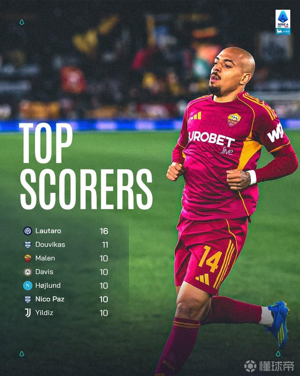 意甲第32轮,罗马主场3-0大胜比萨,马伦上演帽子戏法,至此,冬窗加盟的马伦本赛季意甲已打入10球,并列意甲射手榜第三。