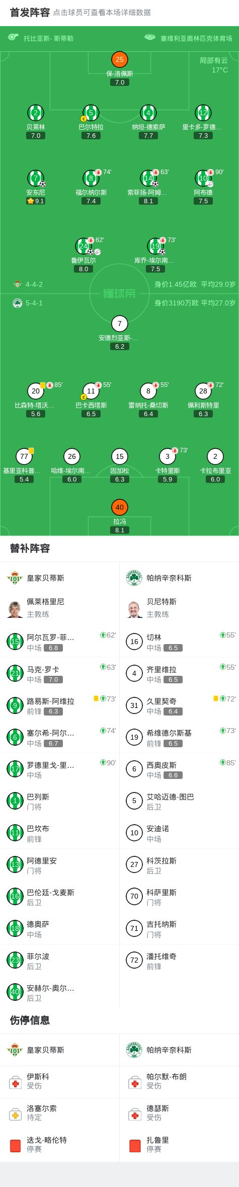北京时间3月20日欧足联欧洲联赛 1/8决赛次回合,皇家贝蒂斯对阵帕纳辛奈科斯。皇家贝蒂斯鲁伊瓦尔破门,索菲扬-阿姆拉巴特破门,库乔-埃尔南德斯破门,安东尼破门。最终比分皇家贝蒂斯 4-0 帕纳辛奈科斯。两回合总比分皇家贝蒂斯4-1帕纳辛奈科斯。